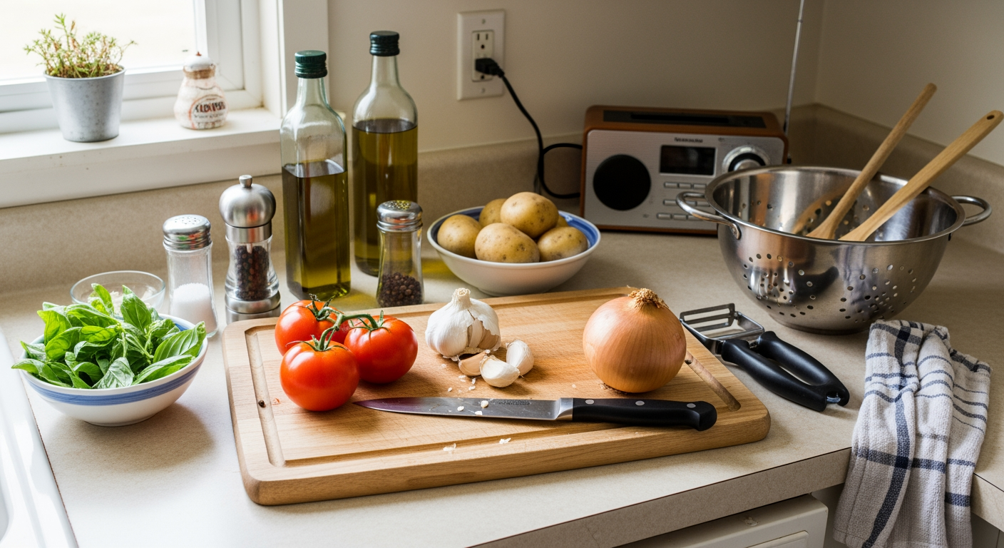 They have onions in the house. Always. They buy garlic pre-minced because chopping four cloves on a Tuesday night is annoying and that's okay. They have canned beans and diced tomatoes in the pantry, so there's always something to make. They have one good pan that they know how to use.